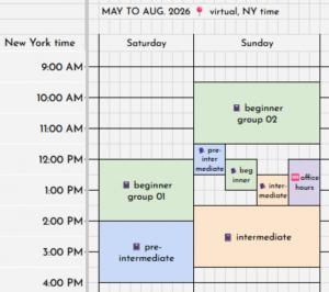 Given the high density of conjugation paradigms and the fact that the course is delivered with two different pragmatic focuses, we highly encourage students to take the pre-intermediate course twice in a row. However, it is always possible to move to intermediate and then return to take your missing pre-intermediate session.